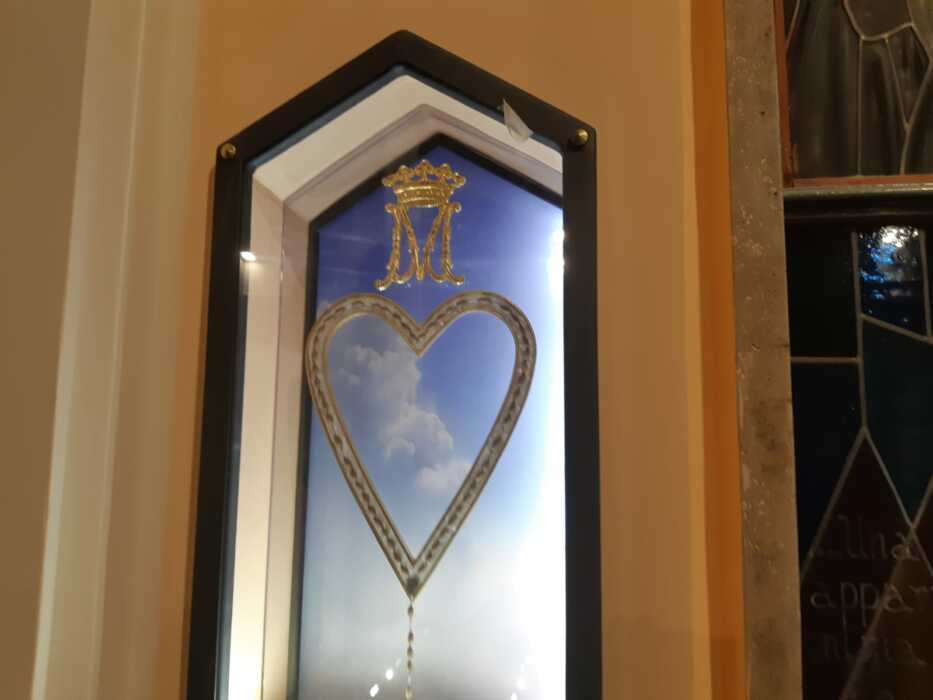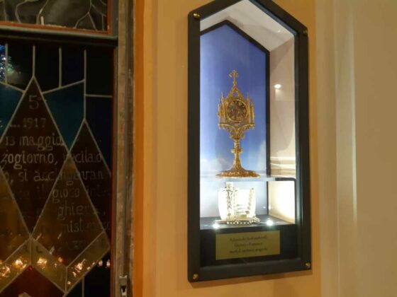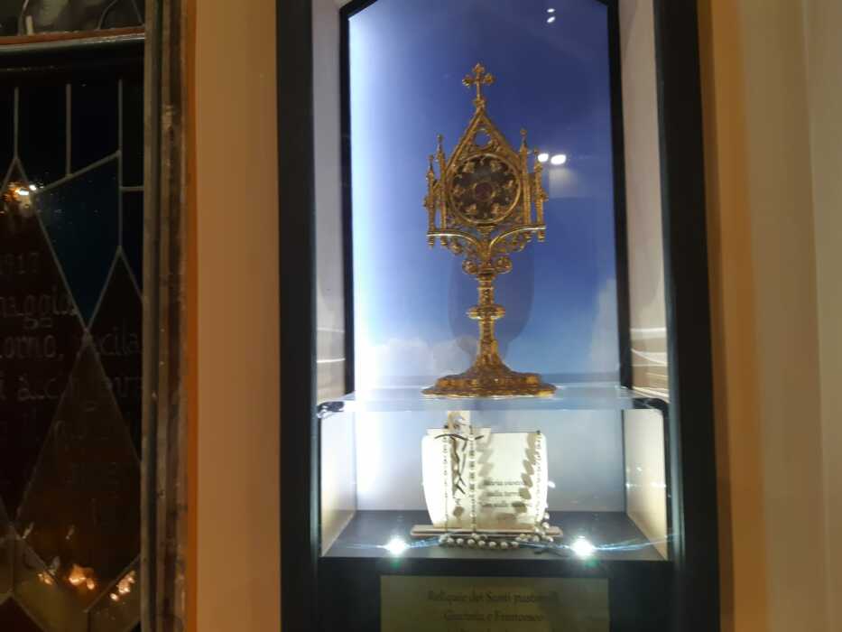 Nell’altra nicchia vi sono alcune reliquie dei Pastorelli di Fatima, da poco canononizzati, Giacinta e Francesco, morti per l’epidemia d’influenza spagnola nei primi del 900, ed un’altra corona del Rosario, tanto caro e tanto raccomandato dalla Madonna, nelle apparizioni di Fatima.
