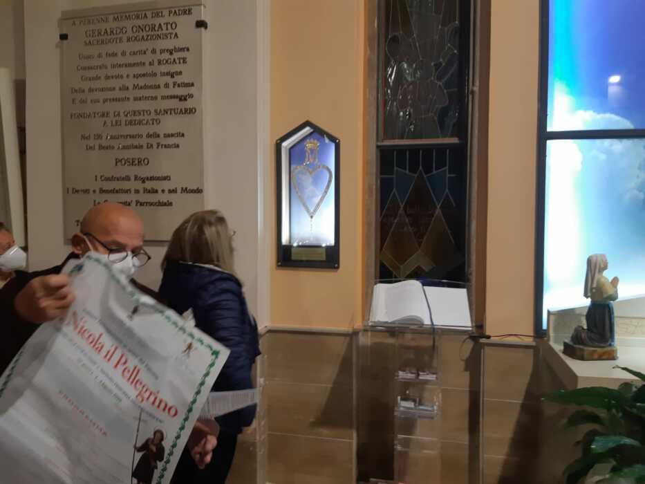 Nella prima nicchia si può ammirare una corona del Rosario realizzato da suor Lucia, una delle tre veggenti di Fatima. Si tratta della corona del Rosario che il vescovo di Fatima diede a padre Gerardo Onorato, fondatore del Santuario di Trani ed altri esponenti ecclesiastici presenti per l’occasione. Lucia dedicò personalmente questo Rosario, fatto con il legno dell’albero presso il quale apparve la Vergine a Fatima, ad un padre domenicano, al padre generale dei padri Rogazionisti e a mons. Addazi, vescovo di Trani. Erano i tempi della fondazione del nostro santuario dedicato alla Madonna di Fatima, il primo in Italia, secondo le notizie raccolte a suo tempo da Mons. Addazi, ed ora dal rettore padre Carlo.