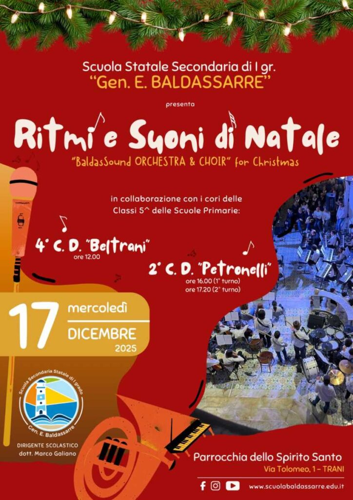 Torna puntuale e come da tradizione il concerto natalizio della scuola secondaria di primo grado “Baldassarre” in collaborazione con i cori delle scuole Primarie “Beltrani” e “Petronelli”, nell’ambito del percorso di “continuità” che ogni anno viene intrapreso tra l’Istituto di piazza Dante diretto da Marco Galiano, con i giovanissimi studenti pronti a farsi coinvolgere dai ritmi e suoni del Natale.